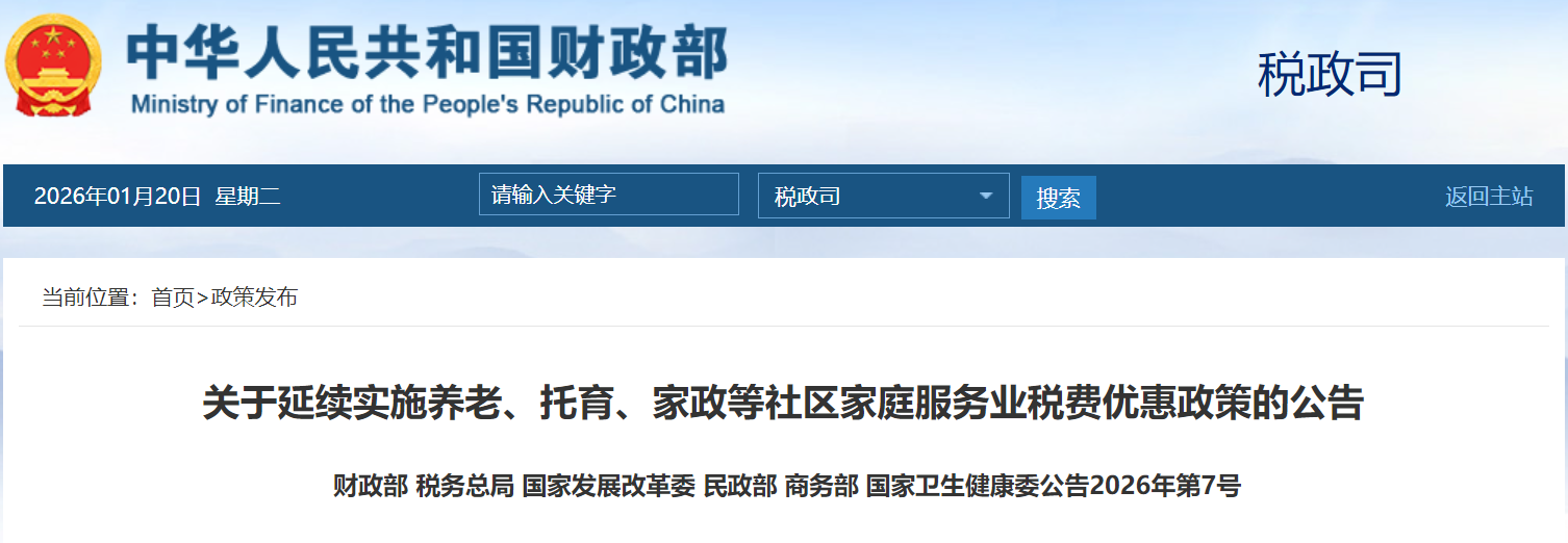1月20日,财政部等部门发布关于延续实施养老、托育、家政等社区家庭服务业税费优惠政策的公告,为社区提供养老、托育、家政等服务的机构,按照规定享受税费优惠政策。